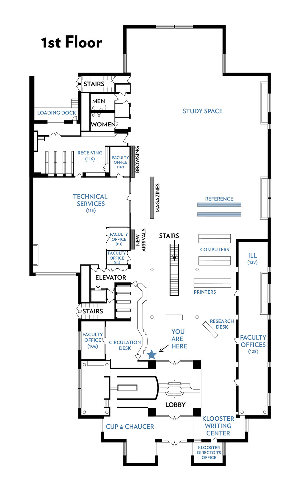 This floor has our newest books, browsing collection and current magazines, as well as reference sources like encyclopedias and dictionaries.